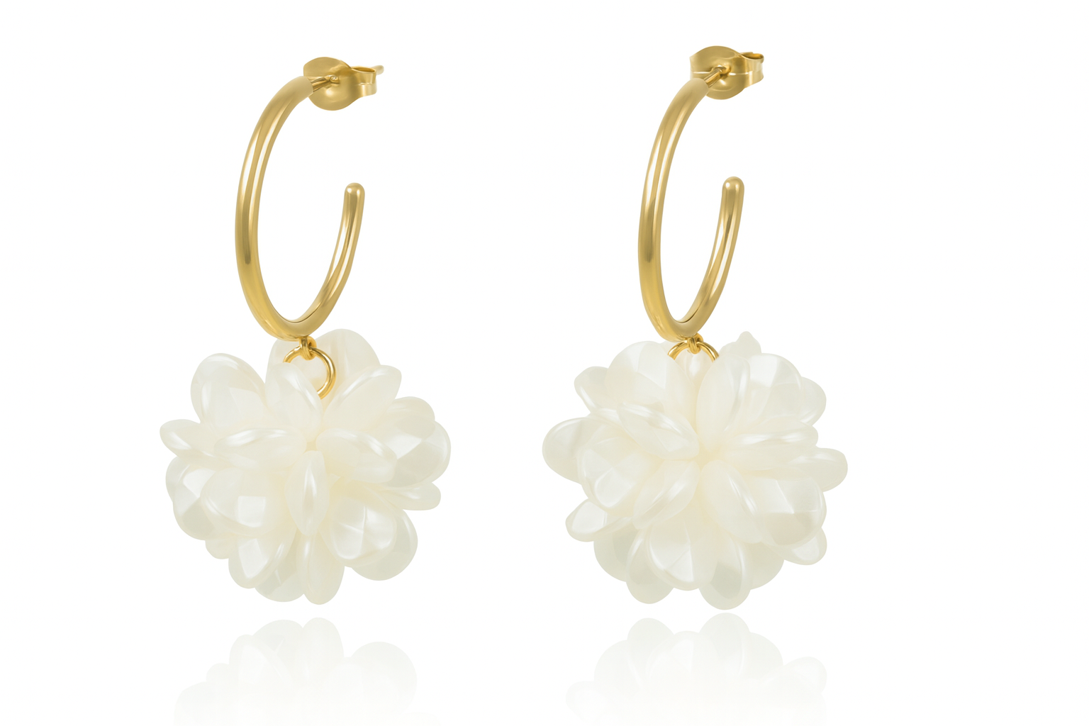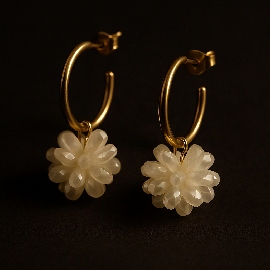 Kolczyki Nolia to połączenie minimalistycznych złotych kół ze stylową, lekką zawieszką inspirowaną formą subtelnego kwiatu. Trójwymiarowy element z akrylu tworzy delikatny, dekoracyjny efekt, który pięknie urozmaica klasyczną formę kolczyków. Model jest lekki, wygodny i idealny zarówno do codziennych stylizacji, jak i wyjątkowych wyjść, dodając im świeżości i kobiecego charakteru.