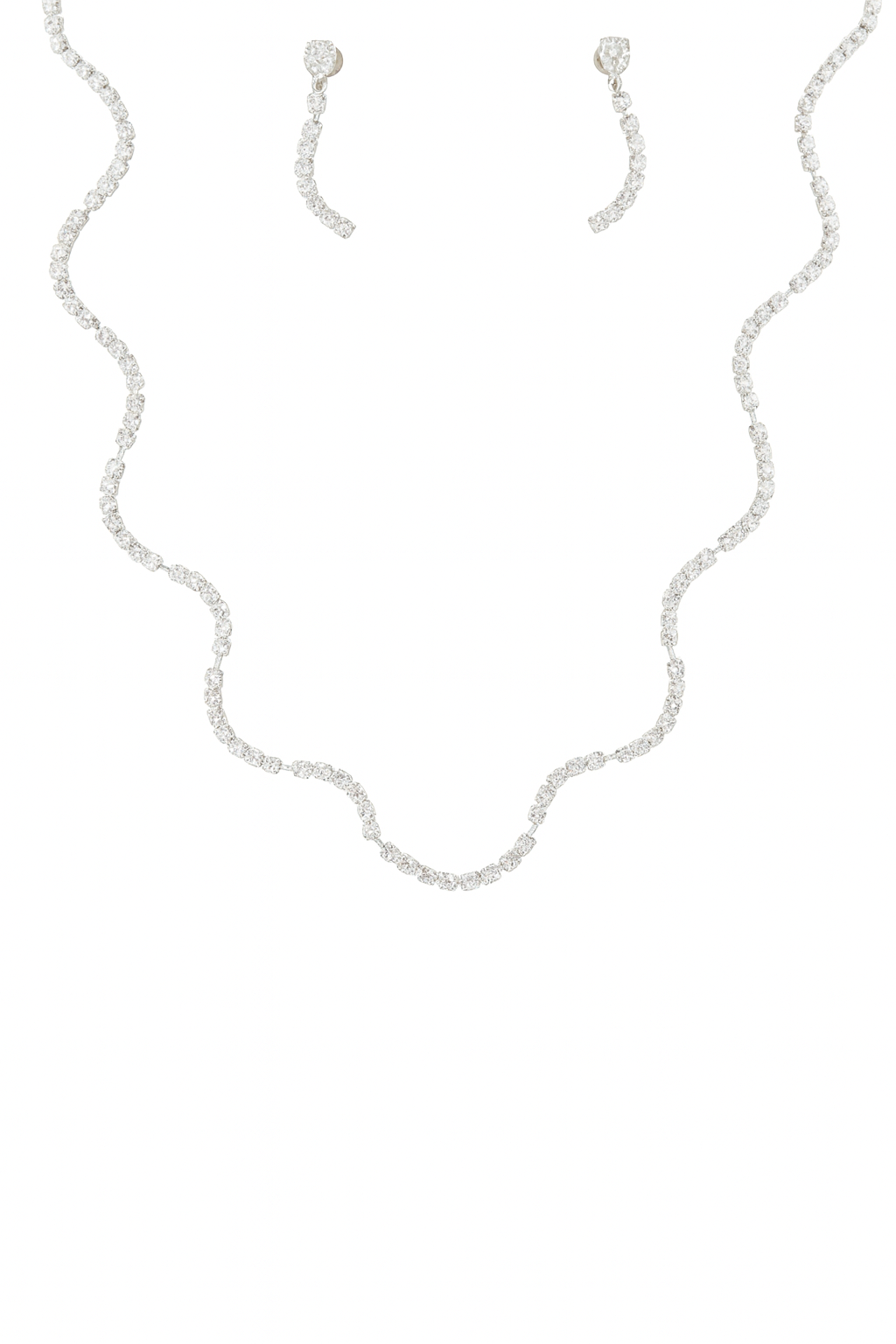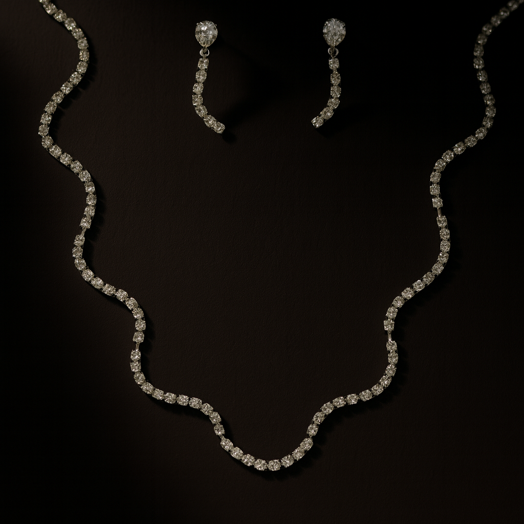 Połączenie naszyjnika i kolczyków zdobionych drobnymi cyrkoniami , tworzącymi efekt elegancji, który podkreśla urodę i dodatek klasy każdej stylizacji.