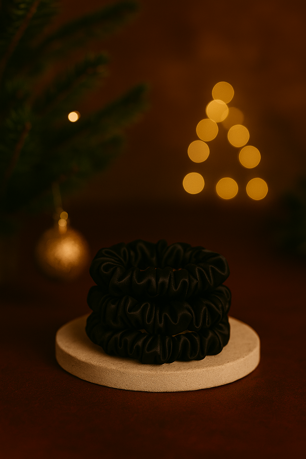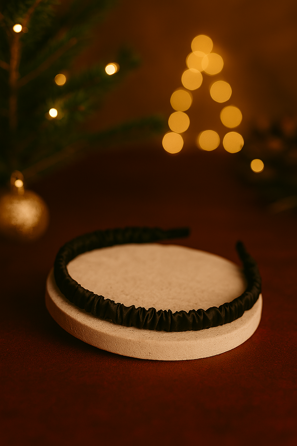 Całość uzupełniają jedwabne akcesoria do włosów – cienka, czarna opaska oraz trzy miękkie gumki do włosów. Ich jedwabista struktura nie niszczy włosów i dodaje stylizacji wyjątkowego charakteru.