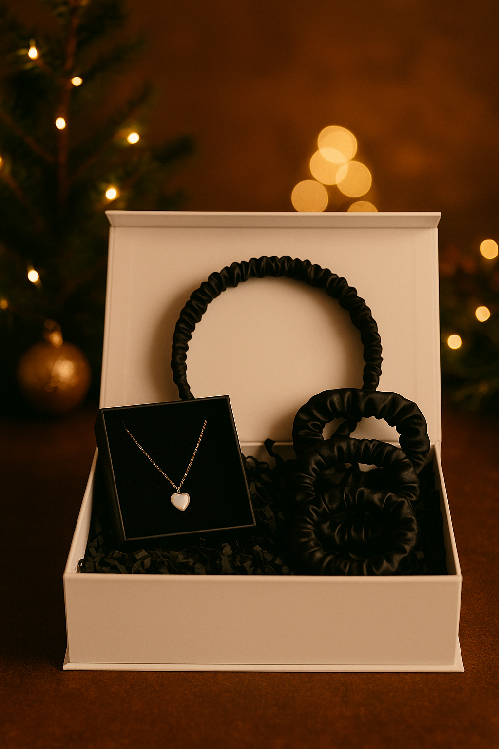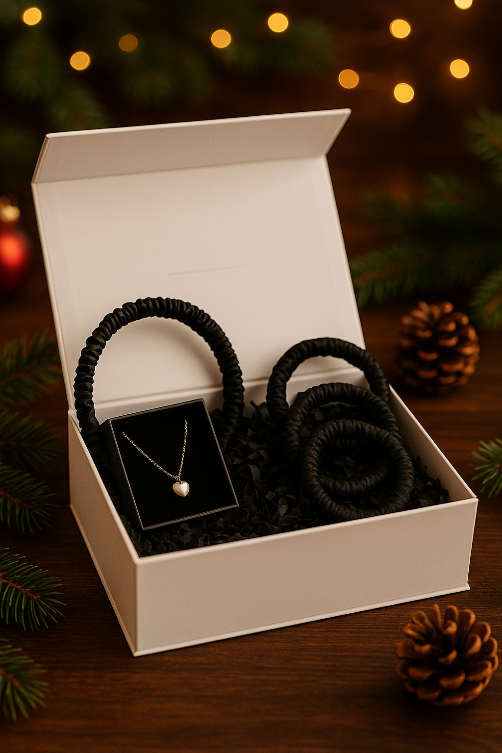 Odkryj wyjątkowy Świąteczny box prezentowy – naszyjnik i akcesoria do włosów, który łączy w sobie elegancję, kobiecość i odrobinę luksusu. To idealny upominek dla każdej kobiety, która ceni subtelne dodatki i dba o każdy detal swojego stylu.